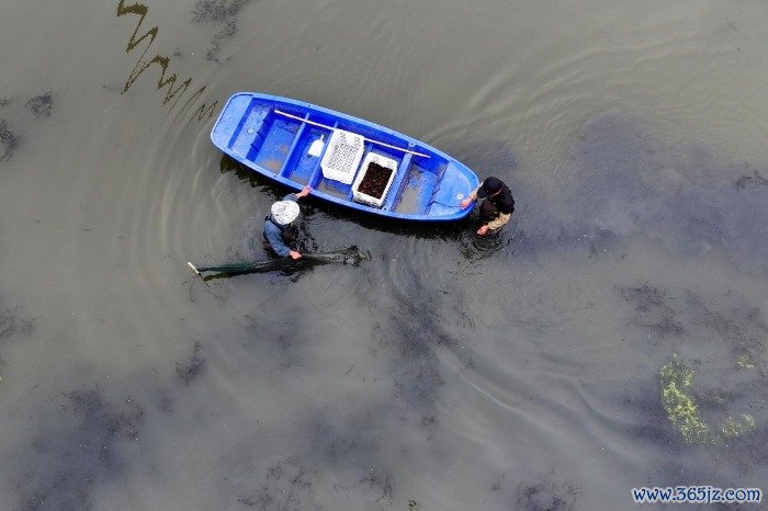 5月15日,在蚌埠市五河县沱湖乡大岗村,工作人员在捕捞小龙虾(无人机照片)。新华社记者 黄博涵 摄